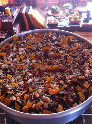 Conheço uns bandidos que são tarados por esse bolo, então decidi prepará-lo, substituindo o gengibre por cardamomo, e adicionando um tiquinho de misk para dar um perfume a mais. Depois dele ter esfriado, reguei o bolo com quatro colheres de cachaça prata e duas de água de rosas, e cobri sua superfície com uma película de mel, usando uma faca para deixá-lo cair em fio. Usei o restinho que tinha de um mel de Morrão de Candeia, que é delicado e complexo; absolutamente viciante. Adicionei castanhas quebradas grosseiramente, tâmaras e damascos em tiras, e mais um fiozinho de mel, na hora de servir, para